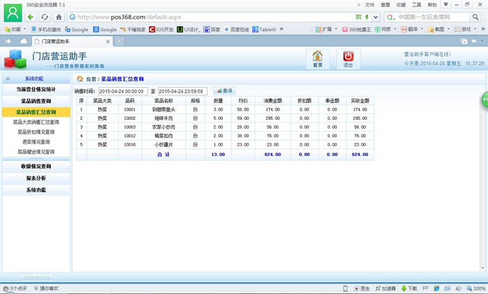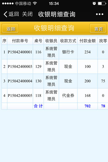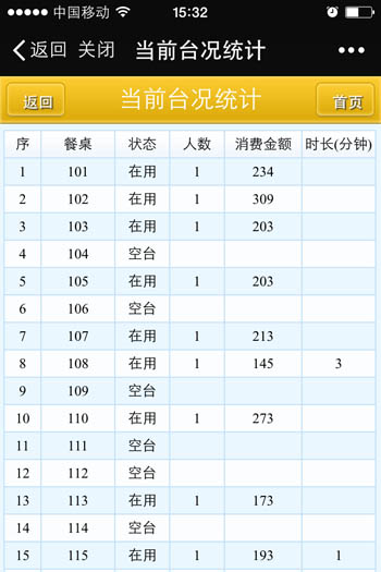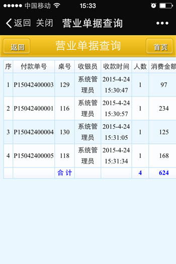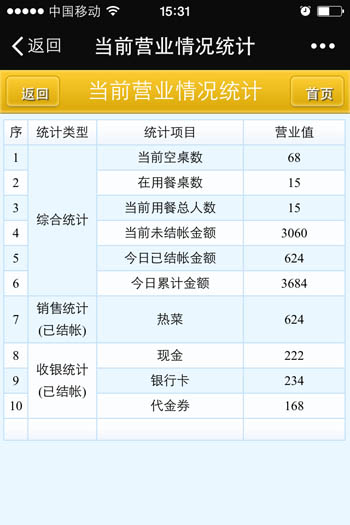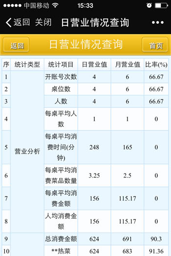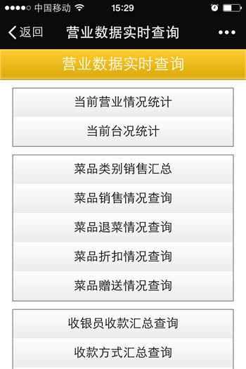 | 當(dāng)前營(yíng)業(yè)情況:當(dāng)前營(yíng)業(yè)情況統(tǒng)計(jì)、當(dāng)前臺(tái)況統(tǒng)計(jì) 銷(xiāo)售報(bào)表:菜品類(lèi)別銷(xiāo)售匯總、菜品銷(xiāo)售情況、退菜查詢(xún)、折扣查詢(xún)、贈(zèng)送查詢(xún) 收銀報(bào)表:收銀員收款匯總查詢(xún)、收款方式匯總、收銀明細(xì) 報(bào)表分析:日營(yíng)業(yè)情況統(tǒng)計(jì)、日營(yíng)業(yè)毛利分析、菜品銷(xiāo)售排行榜、營(yíng)業(yè)單據(jù)查詢(xún)、開(kāi)臺(tái)情況查詢(xún) |